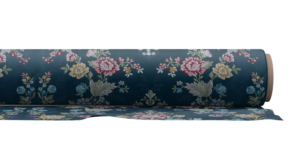 Su elegante dibujo ornamental floral, de gran riqueza decorativa, resalta sobre fondos en tonos intensos, aportando profundidad, brillo y un acabado sofisticado. Este tejido para trajes de fallera combina tradición, resistencia y excelencia técnica, convirtiéndose en una opción ideal tanto para espolines como para proyectos de alta costura valenciana.
